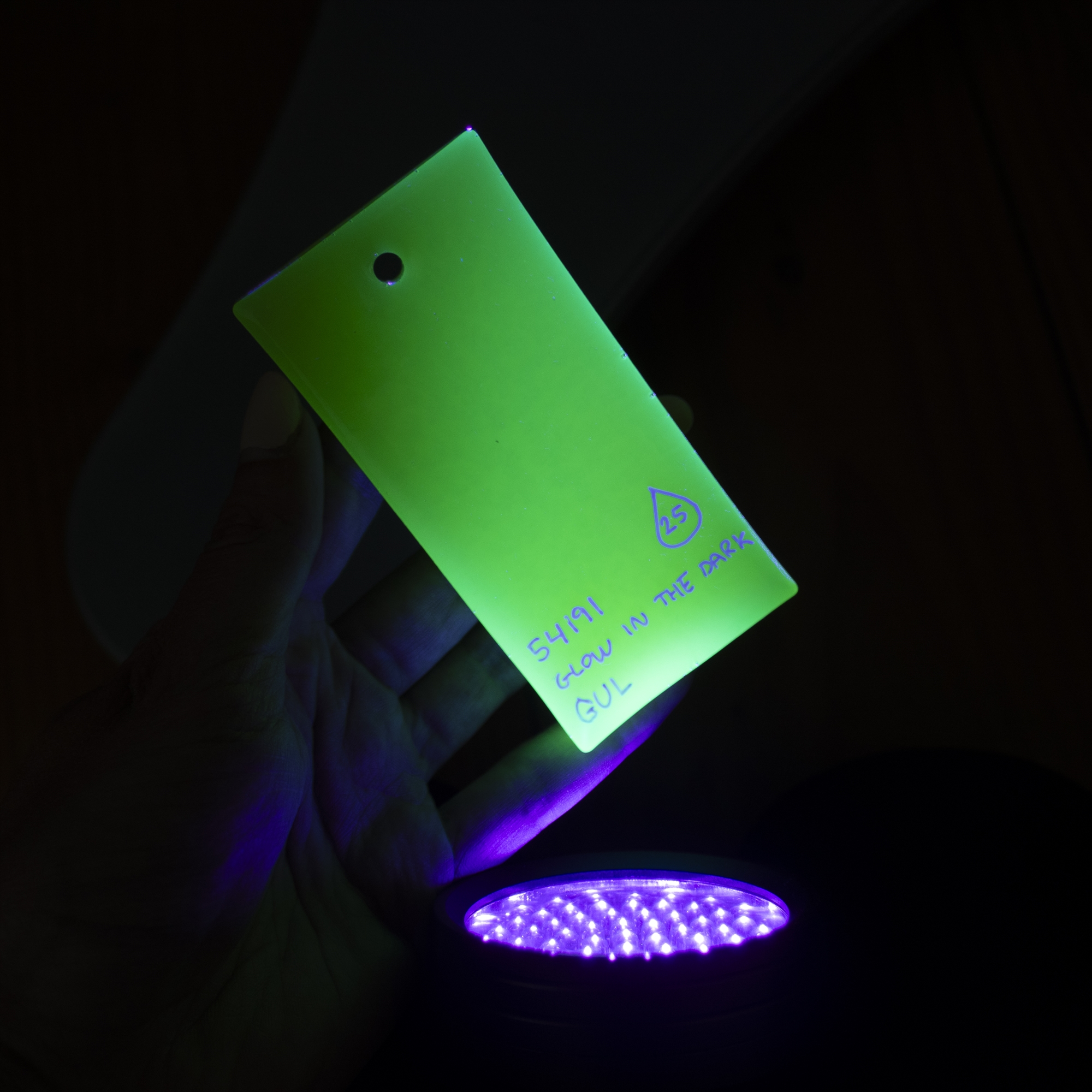 Det fluorescerende pulver optager det almindelige sollys og bevirker at emnet bliver selvlysende i mørke.