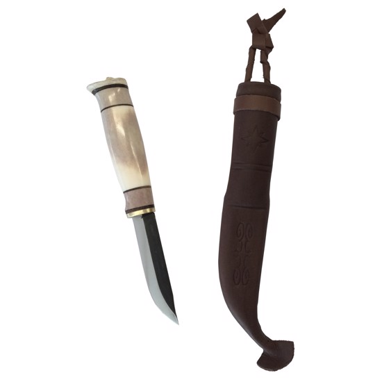 Skæftet er i rensdyrgevir med læderindlæg. Frontholk af messing.