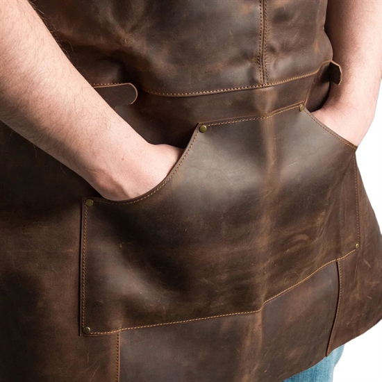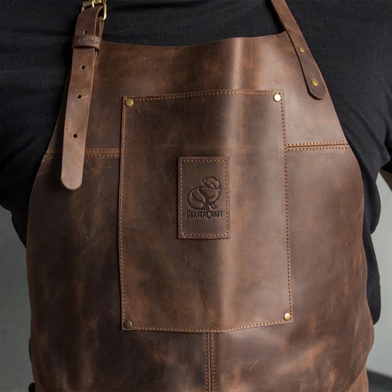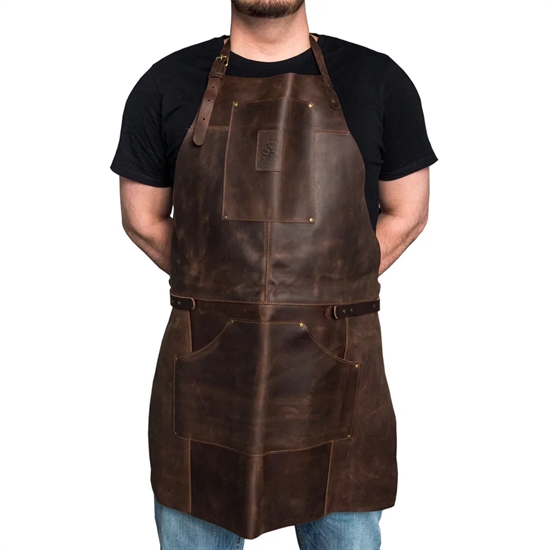 Forklædet er en alt-i-en-løsning for både professionelle og hobbyfolk: træarbejdere, snedkere, mekanikere, teknikere, gør-det-selv-entusiaster, barberere, kokke, grillelskere, baristaer og kunstnere vil alle finde det funktionelt og stilfuldt. Det er fremstillet i kraftigt, ægte brunt læder og dekoreret med metalnitter, maljer og justeringsmuligheder, der giver et elegant og robust udtryk.