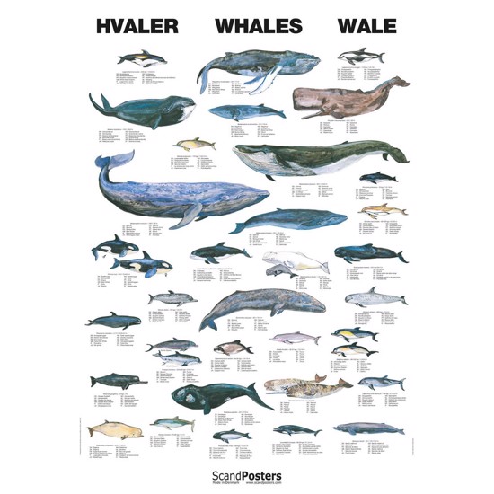 Flot hval-plakat fra ScandPosters med 33 af de mest almindelige hvaler og delfiner i verden. Alle hvalarternes mål og vægt er angivet og deres navne er skrevet på 13 sprog. En fin læringsplakat til børneværelset eller oversigtsplakat i skolens biologilokale, hvor eleverne kan se de forskellige hvalarters ligheder og forskelle. Også en fin gave til den nyuddannede havbiolog.