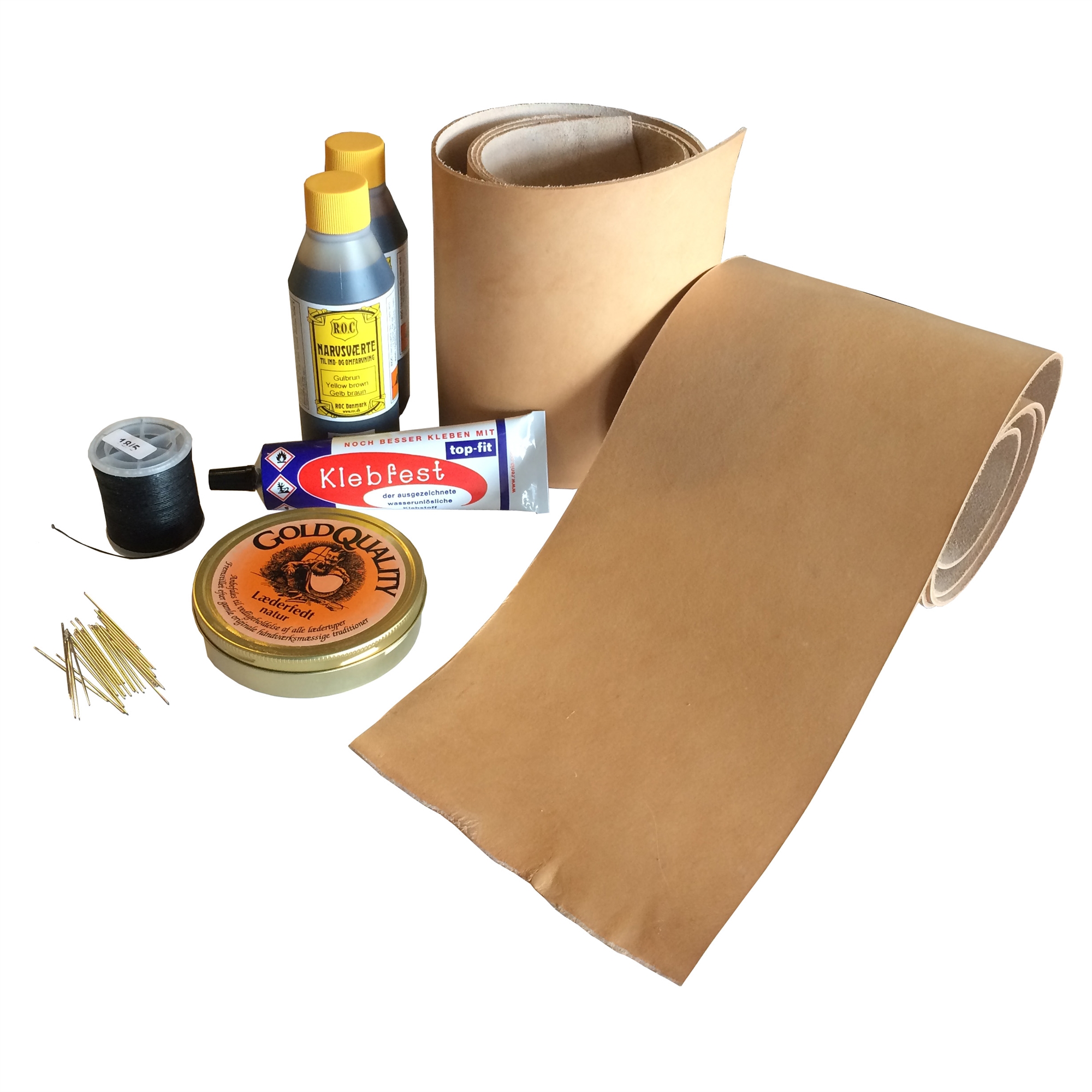 Klassesæt med læder, narvsværte mm. til fremstilling af knivskeder.