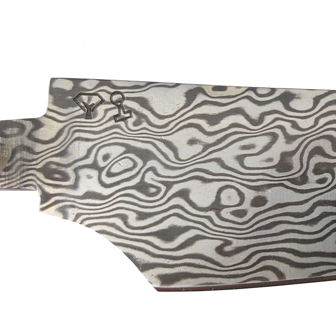 Damaceret knivklinge der er designet i samarbejde med den danske knivmager Henning Rhode.