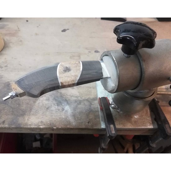 Kniven spændes op i holderen og kan herefter roteres rundt i alle stillinger, så man kan komme til at forme skæftet. Skruestikken spændes med tre kraftige stjernegreb.