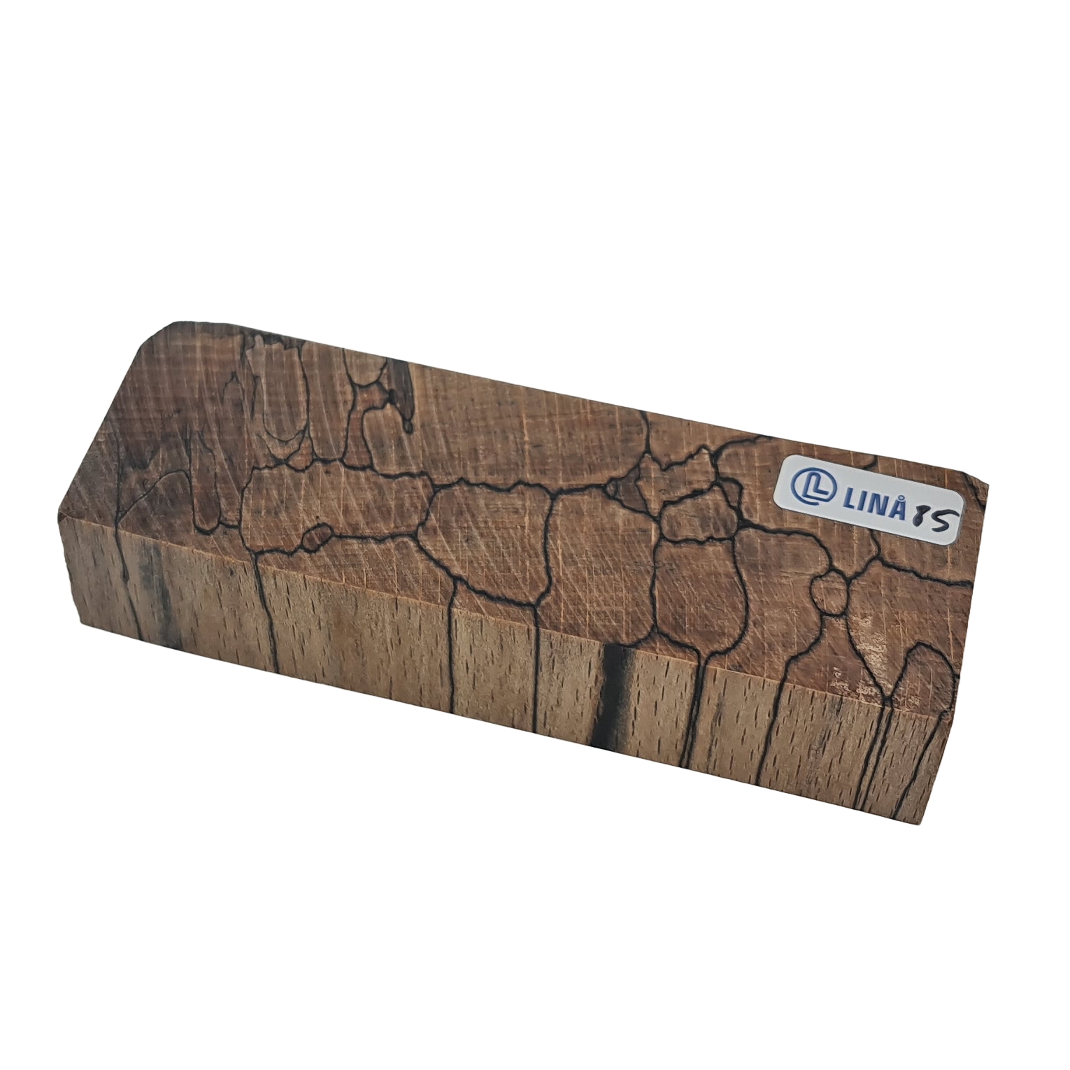 Stabiliseret træemne til knivskæfte – Anløbet bøg med tydelige mørke aftegninger efter rådangreb (stabiliseret af Raffir)