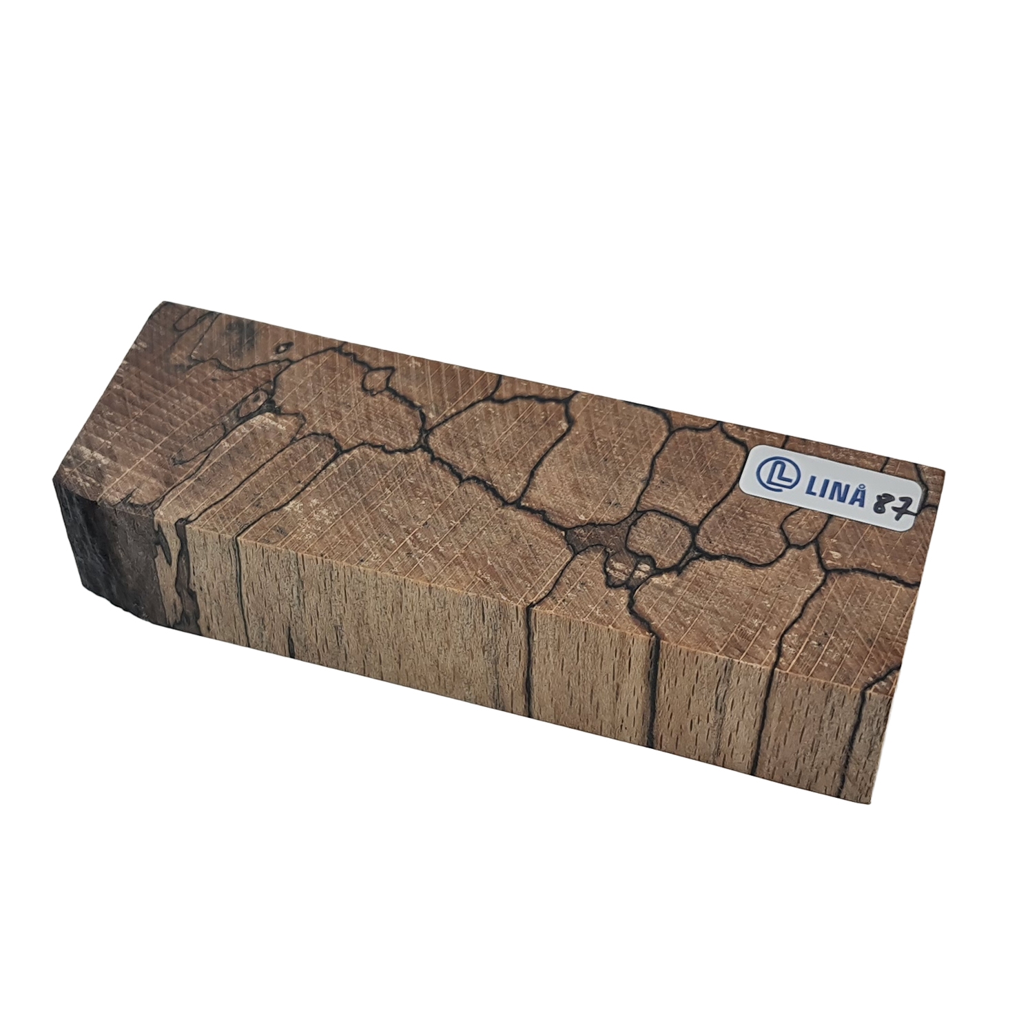 Stabiliseret træemne til knivskæfte – Anløbet bøg med tydelige mørke aftegninger efter rådangreb (stabiliseret af Raffir)