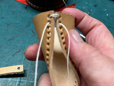 Du skal nu til at sy. Træk nålene igennem det øverste hul. Sy igennem hullerne to gange, sørg for at nålene kommer ud på indersiden af kræmmerhuset.