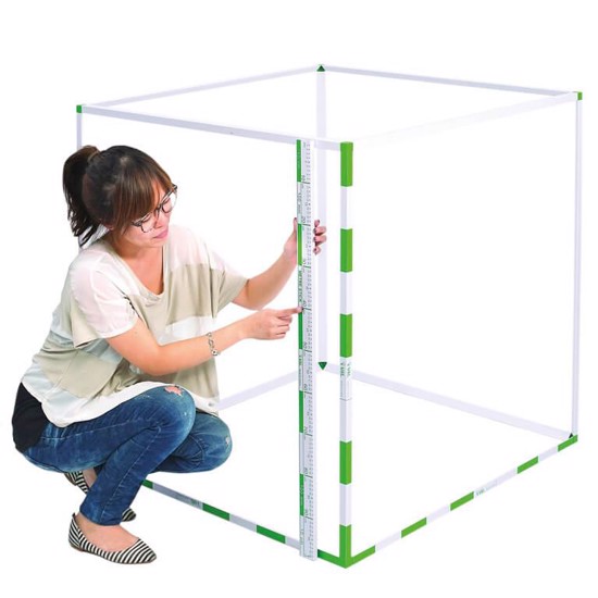 Kubikmeter-modellen er af solid, trekantsprofileret plastik, som sammenføjes i hjørnerne med vinkelklodser. Tre af modellens sider har decimetermarkeringer.