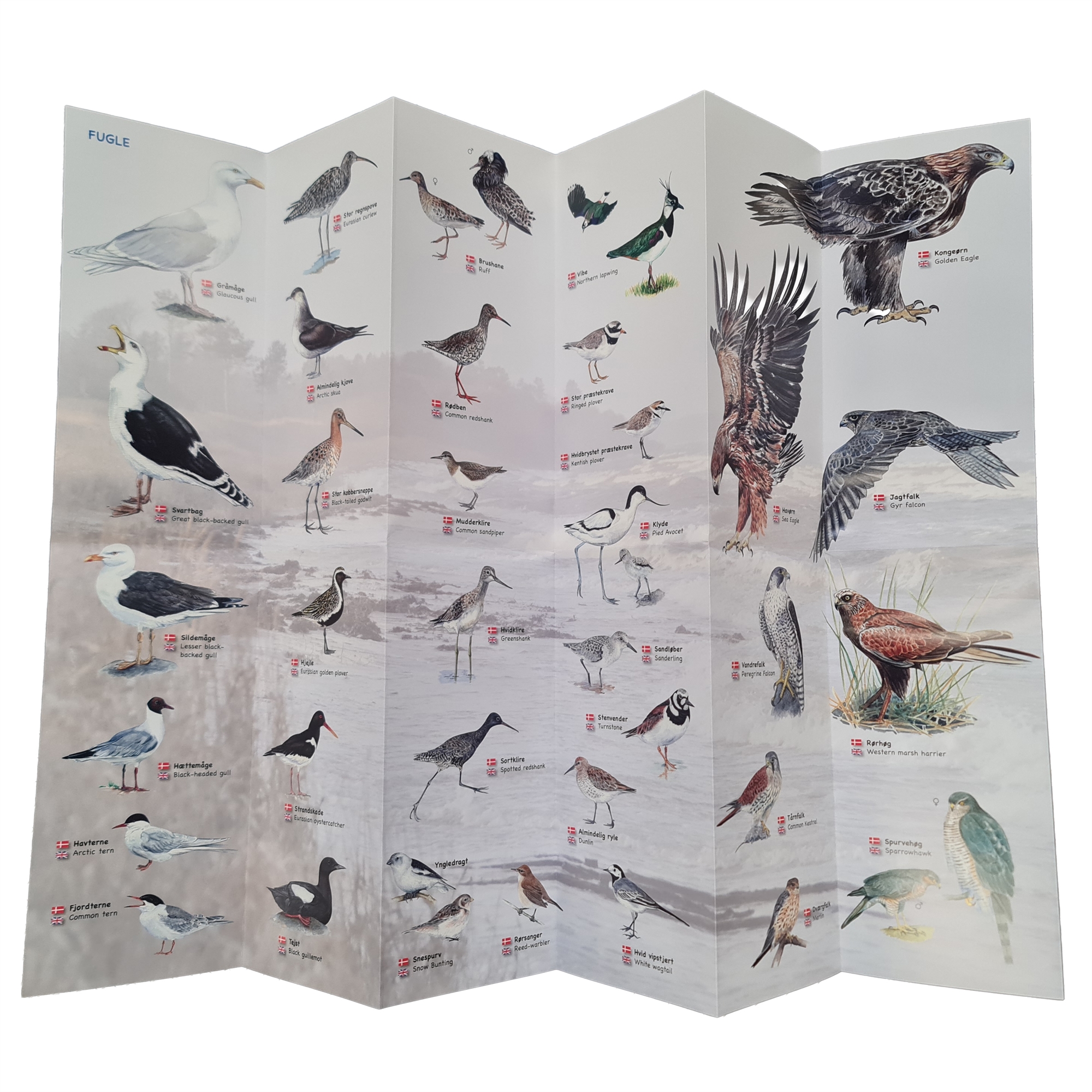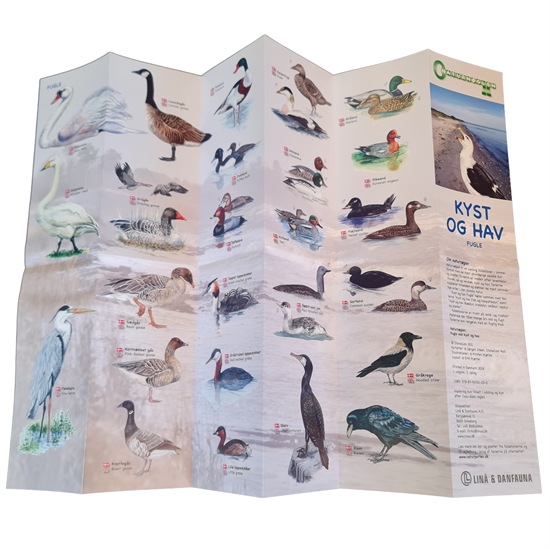 Foldetavlen "Kyst og Hav - Fugle" har tydelige billeder af forskellige kystfugle i den danske natur.