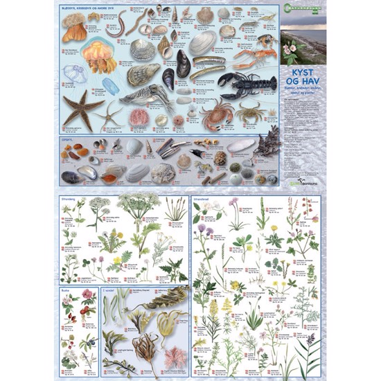 Plakaten viser mange af de buske og planter, som du finder på strandengen og ved strandbredden. Derudover er der illustrationer af forskellige bløddyr som vandmænd og søstjerner samt krebsdyr og skaldyr. Der er også afbildet noget af det, du kan finde på stranden, f.eks. skaller, rav og forsteninger. Navnene står på dansk og engelsk.