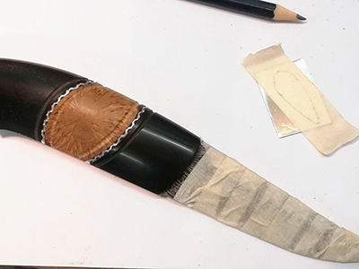 Når du skal lave en skabelon til endepladen, dækker du enden af skæftet med malertape. Herpå kan du tegne endepladen.