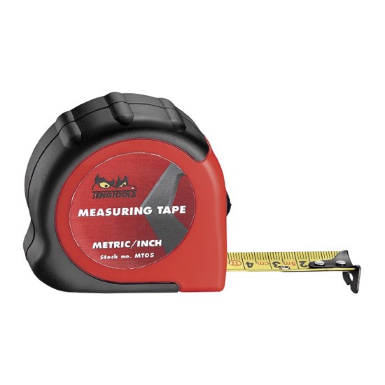 Det selvoprullende bånd har fastlåsefunktion og bevægelig endekrog. Skalaen er på den ene side af båndet og er inddelt i både meter og engelske tommer.