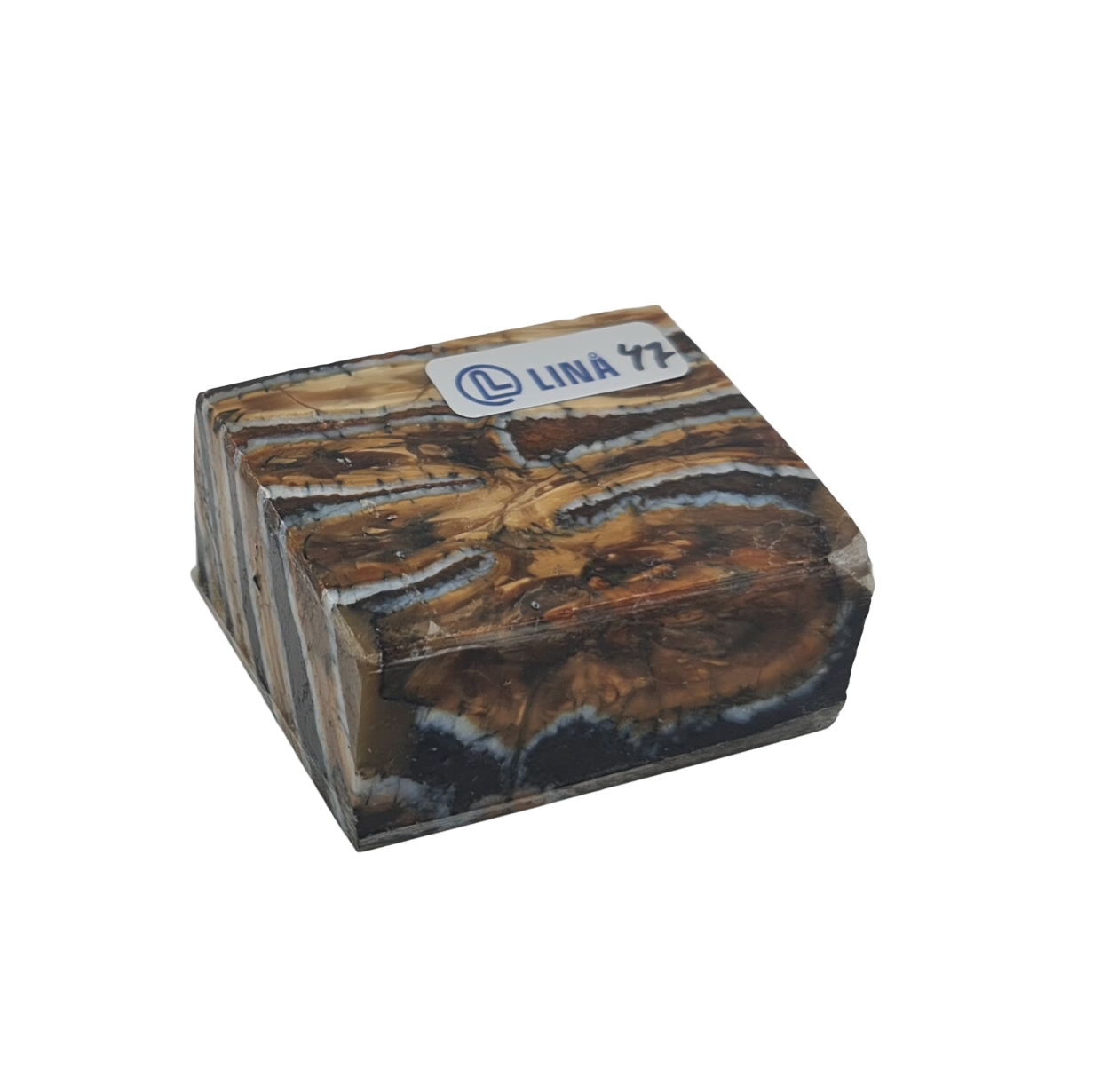 Mammut kindtand, også kaldet mammut molar, stabiliseret af Raffir er et særligt materiale med både historie og karakter. Tanden stammer fra den sidste istid, anslået 10.000 til 40.000 år tilbage, og bærer tydelige spor af sin oprindelse i struktur og farvespil. Gennem stabilisering med resin er materialet gjort anvendeligt til moderne håndværk, hvor det ellers fossile og porøse udgangspunkt får styrke og holdbarhed nok til praktisk brug.