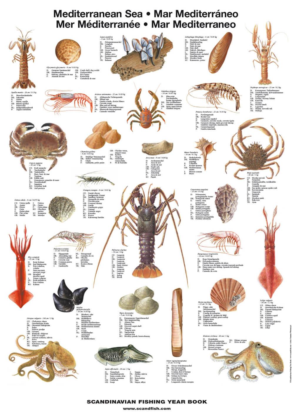Plakat med 28 af de mest almindelige skaldyr i Middelhavet.