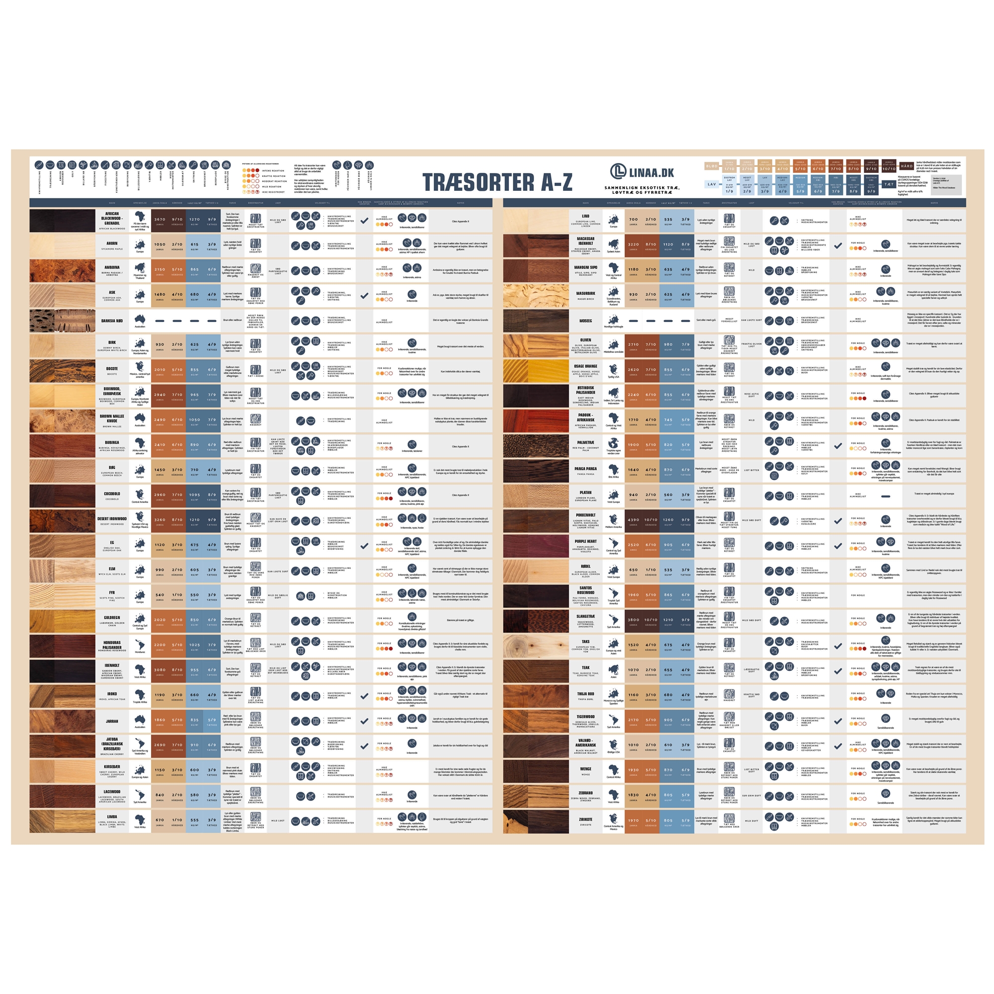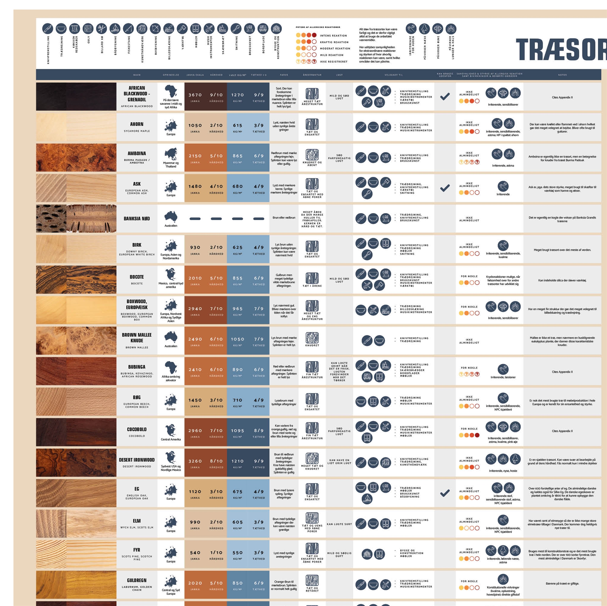 • Den fungerer som et praktisk opslagsværk i hverdagen med tydelig information om egenskaber som hårdhed, densitet og anvendelsesområder, samt oplysninger om blandt andet hvilket land træet vokser i.