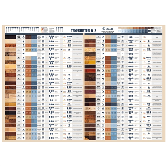 Hver træsort er præsenteret med klare farveprøver og strukturer, så man hurtigt kan danne sig et indtryk af materialets karakter. Informationen er opstillet på en måde, der understøtter fordybelse og overblik, hvilket gør plakaten anvendelig både som læringsværktøj og som dagligt referencepunkt.