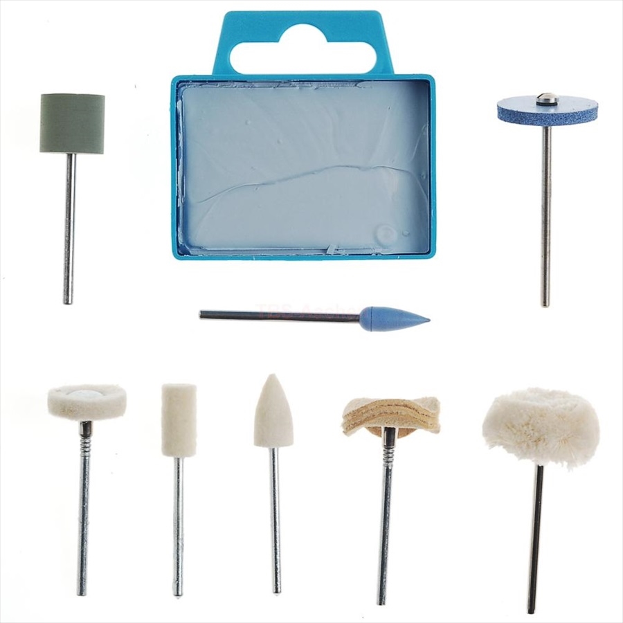 Sættet indeholder filtpolerstifter (cylinder-, kegle- og hjulformet), silikone polerstifter (projektil-, cylinder- og skiveformet), bomuldspolerskive,