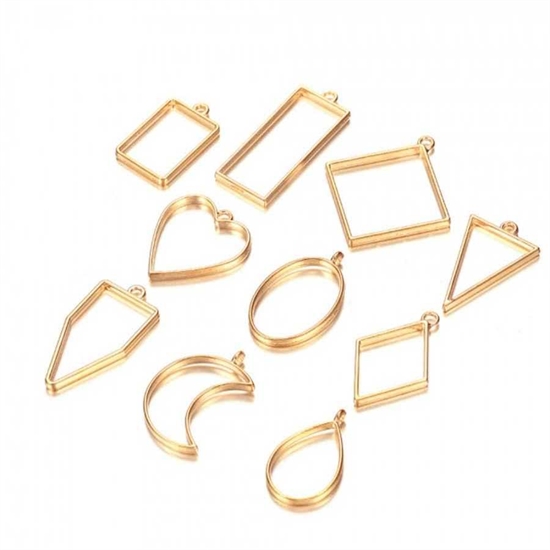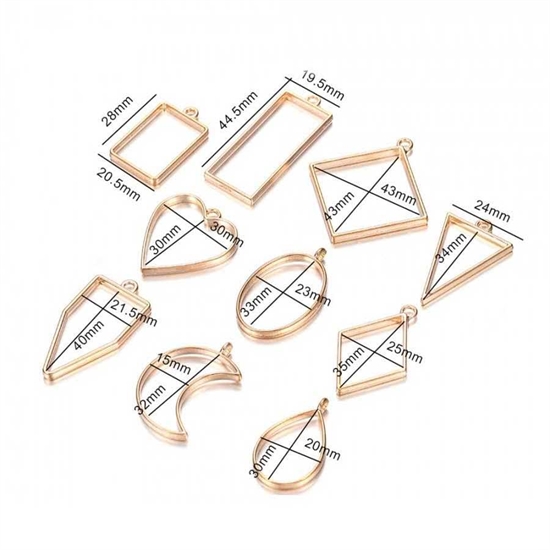 Dette sæt med 10 stk. smykkevedhæng, bestående af forskellige metalforme, er ideelt til fremstilling af smykker med UV-Resin, Epoxy mm.