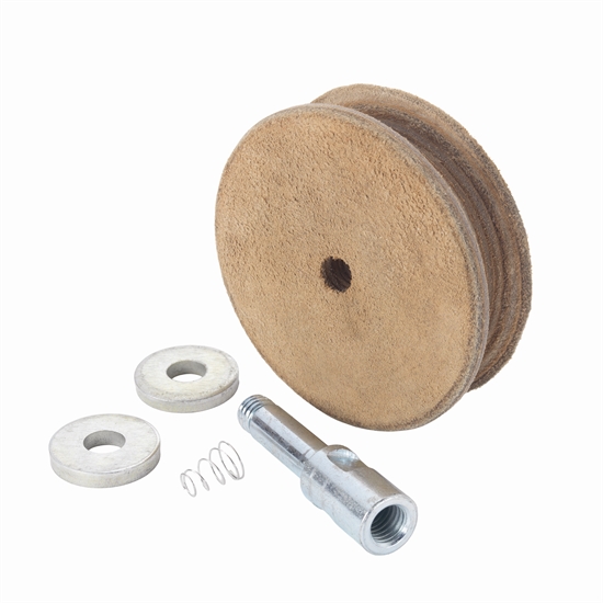 Læderskiven sidder monteret på maskinen ved køb og denne version anvendes som udskiftning, når den originale profilerede skive er slidt eller skal fornyes.