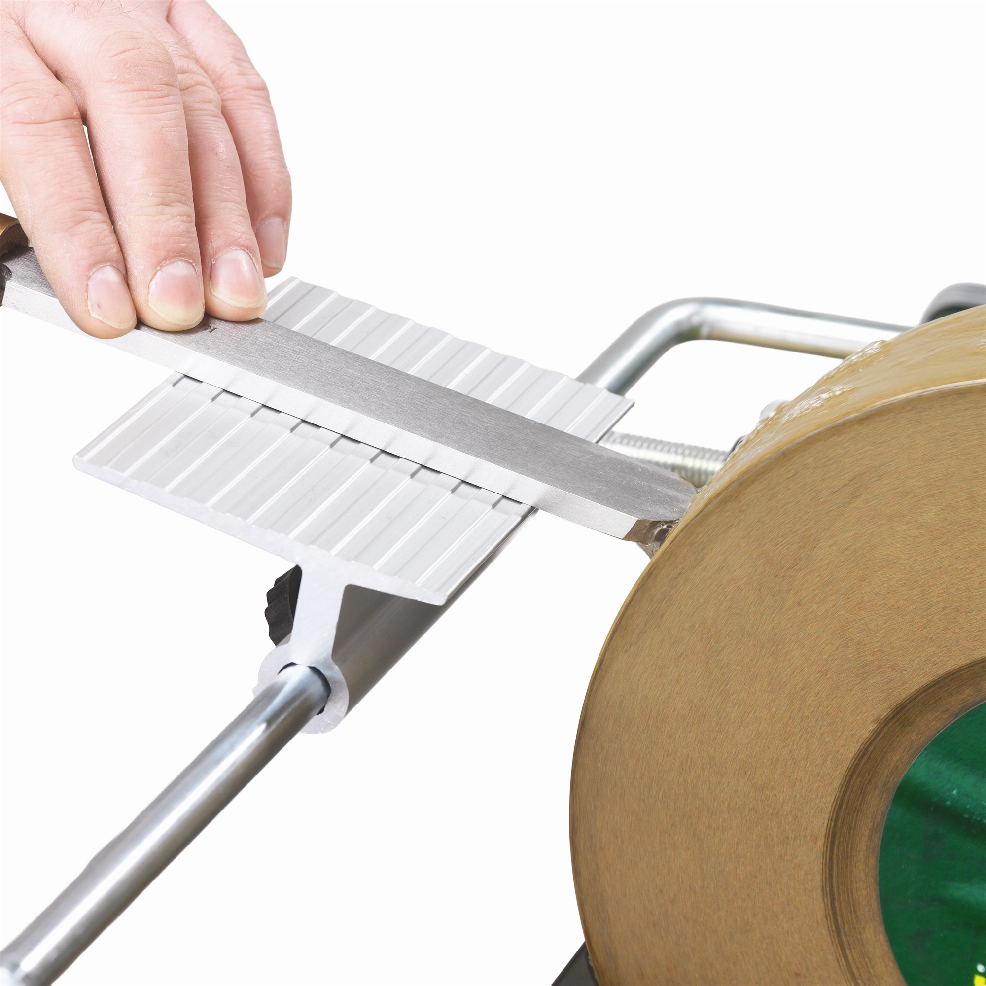 Slibestøtten giver en kontrolleret og ensartet føring mod slibestenen, hvilket gør det lettere at opretholde en stabil slibevinkel og et jævnt tryk under arbejdet. Det bidrager til en mere præcis æg og et ensartet resultat over hele værktøjets længde.