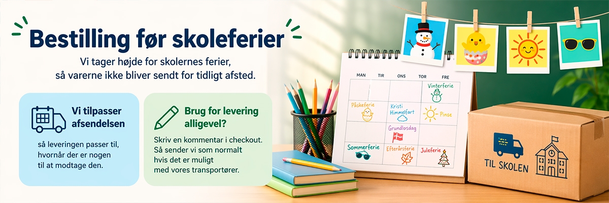 Vi tager højde for skolernes ferieperioder, så varer ikke bliver sendt afsted, mens skolen er lukket.