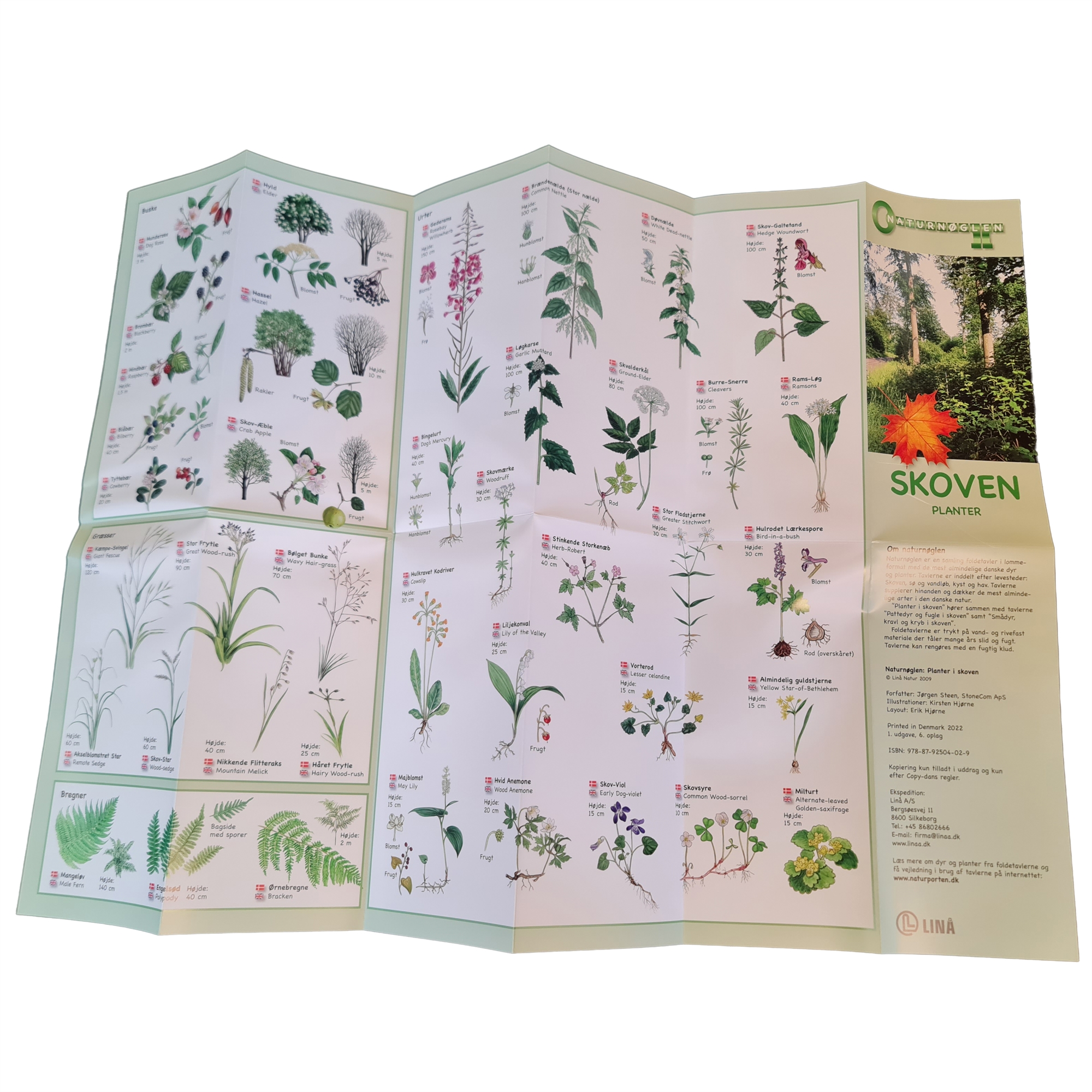 Foldetavlen "Skoven - Planter" har tydelige billeder af danske træer og planter.