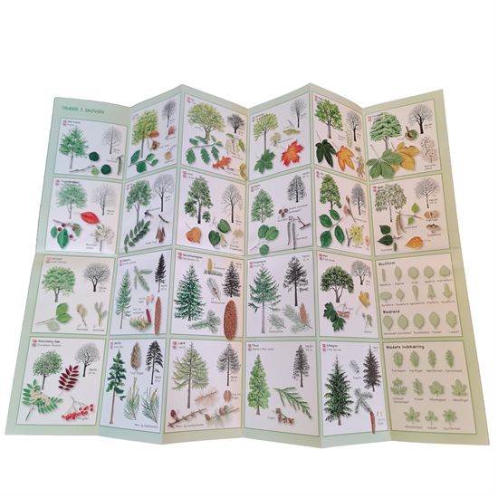 På foldetavlens ene side vises 22 af de mest almindelige træer illustreret både med og uden blade og med nærbilleder af blade, frugter og blomster. Desuden er der en nøgle til bestemmelse af bladets form og indskæringer. På foldetavlens anden side findes buske, græsser, bregner og urter, ligeledes med blomster, frugter og størrelse på planten. Navne på dansk og engelsk.