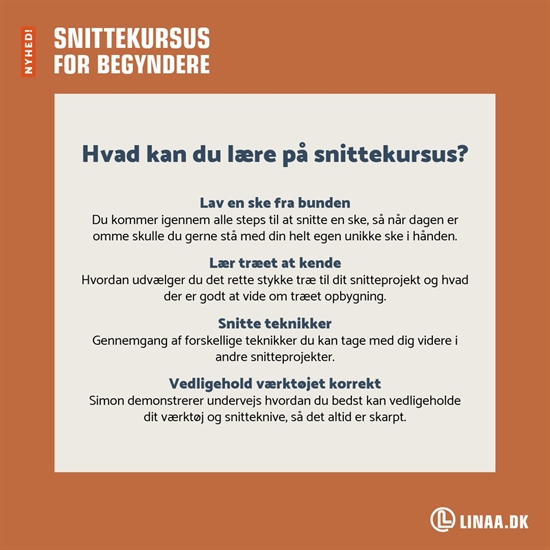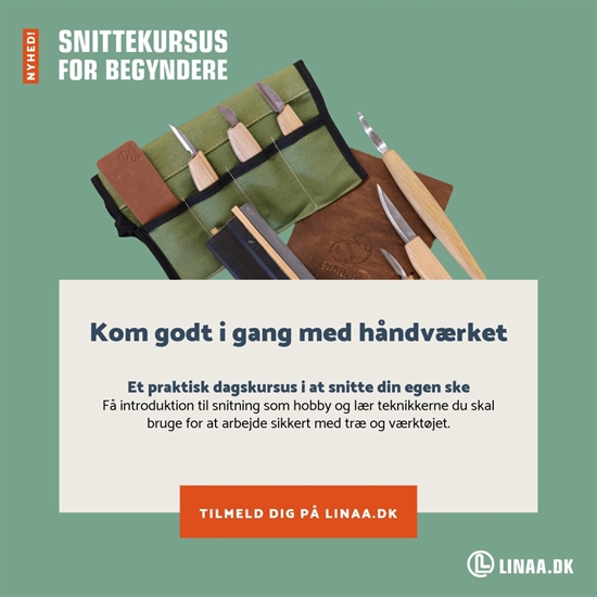 Har du interesse for arbejde med træ, og kunne du godt tænkte dig en ordentlig introduktion til snitning som hobby? Så kom på begynderkursus hos Linå, og få en god start på din rejse med snitning. Kurset er et praktisk kursus, hvor der lægges særlig vægt på sikker brug af værktøjet samt gennemgang af processen med at snitte en ske fra start til slut.