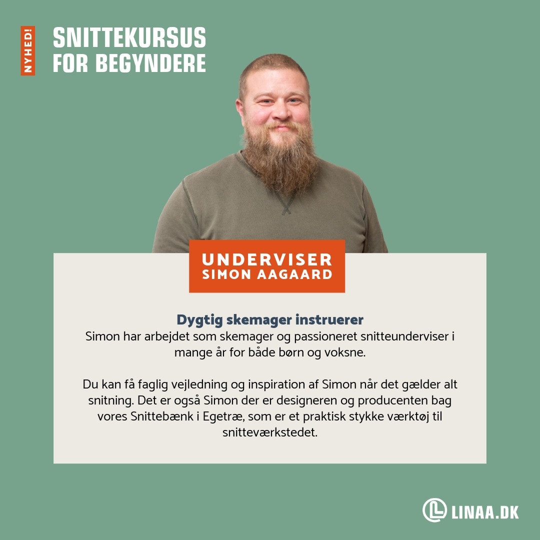 Linås egen snitter og skemager Simon Aagaard er en passioneret underviser, der har arbejdet med snittekurser i mange år. Simon har arbejdet med træ hele sit liv og har dedikeret en stor del af sin tid som snitter og skemager. Snittebænke i egetræ, som forhandles på linaa.dk, er også lavet af Simon i hans eget værksted    Simon Aagaard