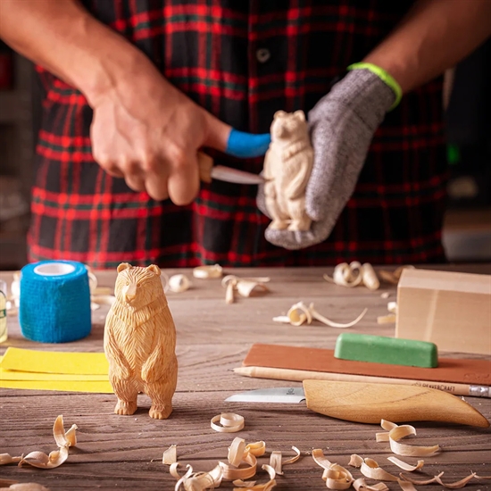 Sættet indeholder alle nødvendige værktøjer og materialer: en stor grovkniv til at forme træet, to basswood-emner, der er bløde og nemme at snitte, tre stykker sandpapir til at glatte overfladen, samt en læderstrop med poleringspasta til at vedligeholde knivens skarphed. Skærebeskyttelsestape medfølger for sikkerhed under snitningen, sammen med en blyant til markering og skitsering. Sættet indeholder også naturlig linolie – en perfekt finish, der beskytter og fremhæver træets åretegning – samt en detaljeret trin-for-trin vejledning, som guider dig gennem hele snitteprocessen.