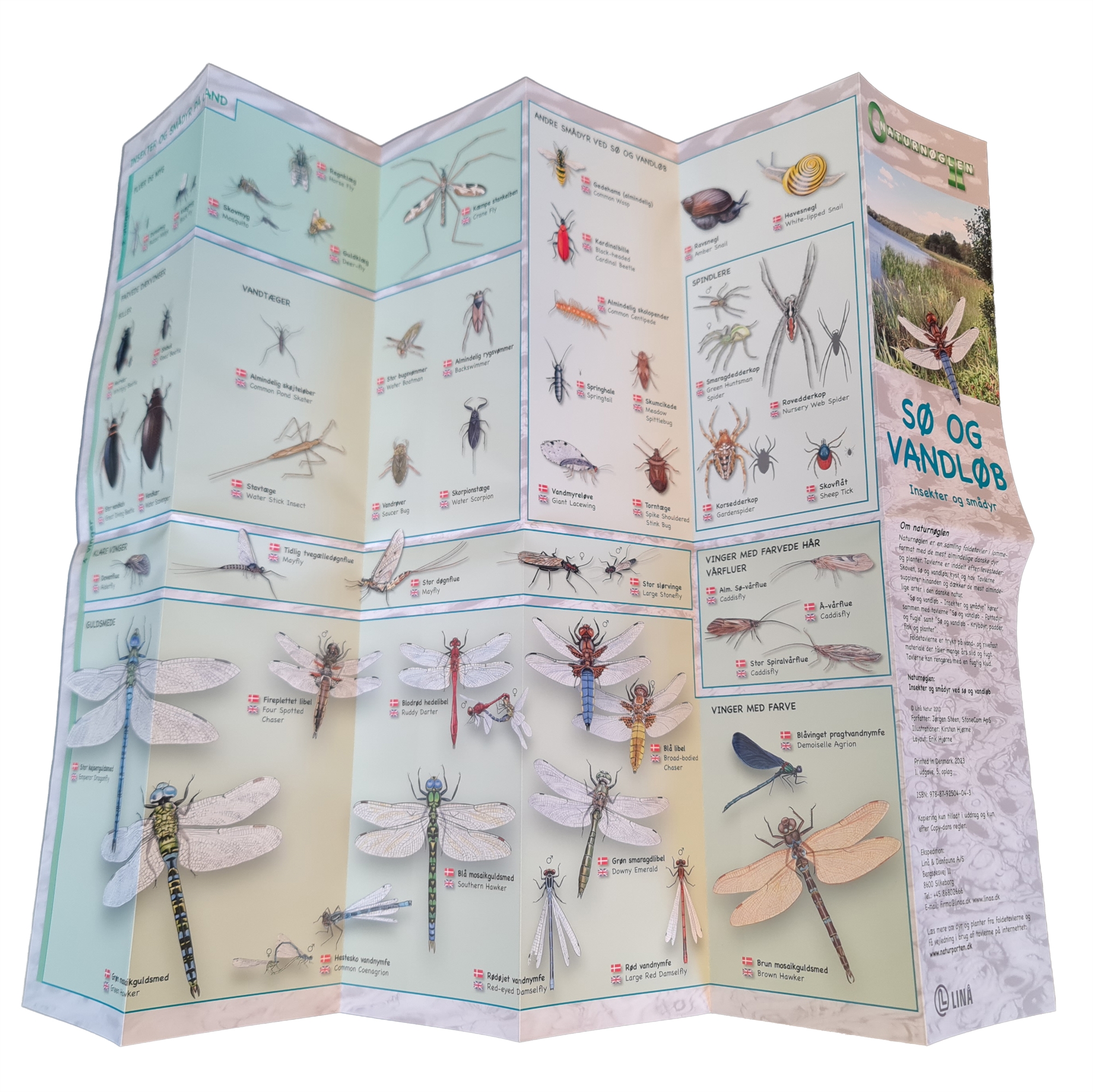 Foldetavlen "Sø og Vandløb - Insekter og smådyr" har tydelige billeder af de forskellige insekter og smådyr, du finder i den danske natur.