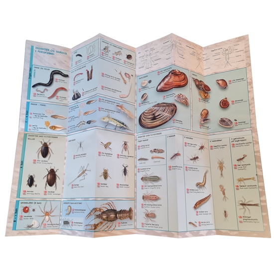 På foldetavlen kan du se de mest almindelige vandinsekter og smådyr, som findes ved søer, vandhul og vandløb. Der er vist to måder at sortere smådyrene på – efter antal ben og for insekternes vedkommende efter deres vingers udseende. Ved de meget små insekter er den virkelige størrelse vist som en grå silhuet ved siden af illustrationen. Navne på dansk og engelsk.