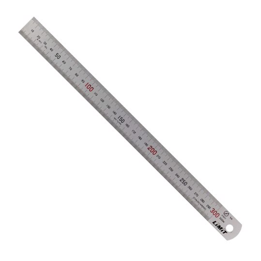 Målestokken starter ved 0 og måler op til 300 mm. Den er skalainddelt i millimeter på overkanten og halve millimeter på underkanten. Dens overflade er matforkromet for at skabe en blændfri aflæsning. Bagsiden er blank.