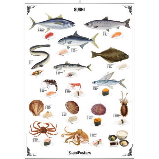 Under hver fisk/skaldyr på plakaten er det tilhørende sushi-stykke gengivet, ligesom det japanske navn for sushi-stykket er angivet. Hver fisks og skaldyrs latinske navn er oversat til 5 sprog: dansk, engelsk, norsk, svensk og tysk.