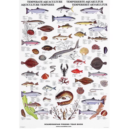Plakat med 47 af de mest almindelige opdrættet tempereret fisk og skaldyr samt 7 havalger.