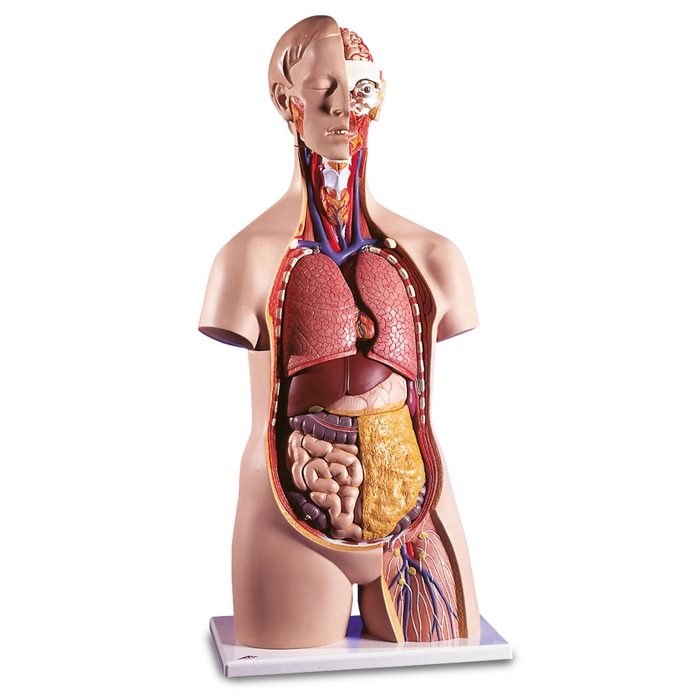 Flot og pædagogisk skolemodel af menneskets torso i naturlig størrelse. Modellen har 14 aftagelige dele med tydelige farver.