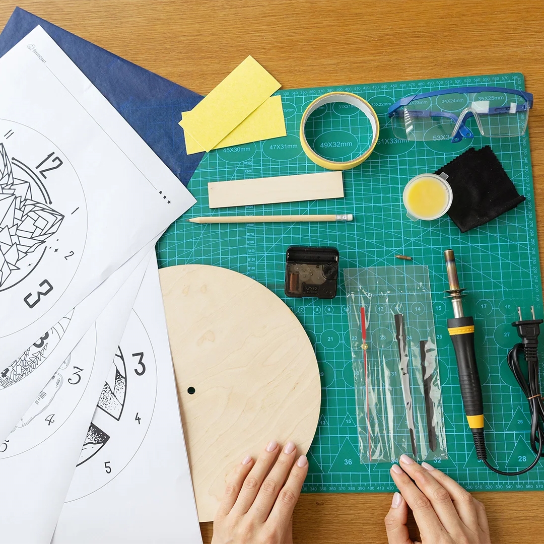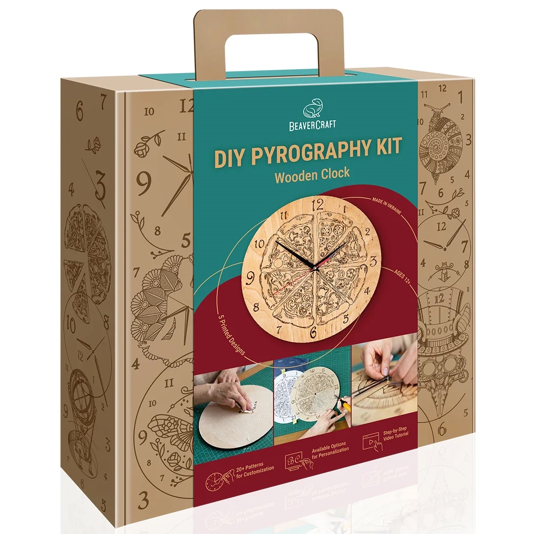 Kittet indeholder desuden færdige designskabeloner i A4-format, grafit-overføringspapir, sandpapir, blyant, trævoks til afslutning og urværk med visere. Der medfølger en vejledning, så du kan samle og færdiggøre uret korrekt.