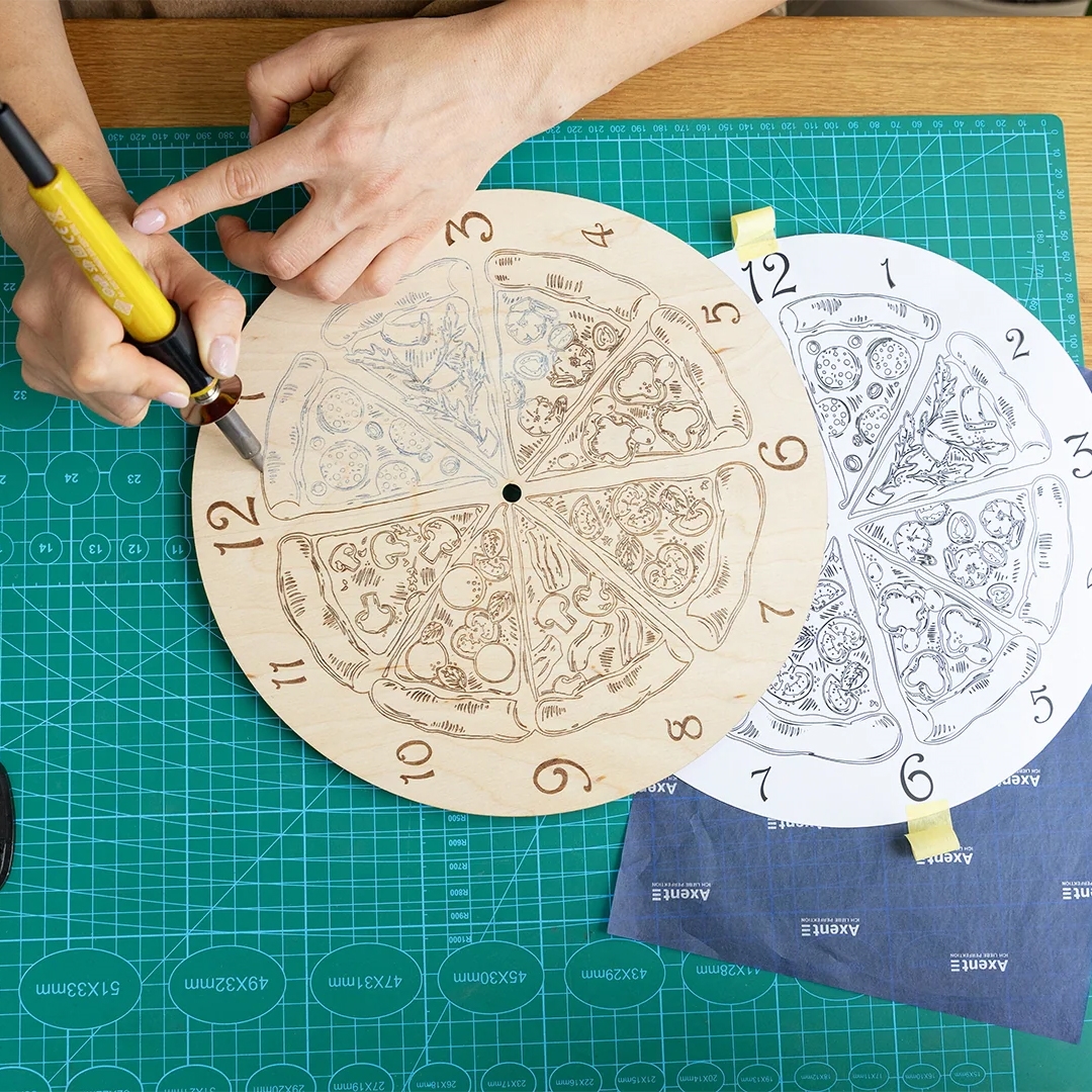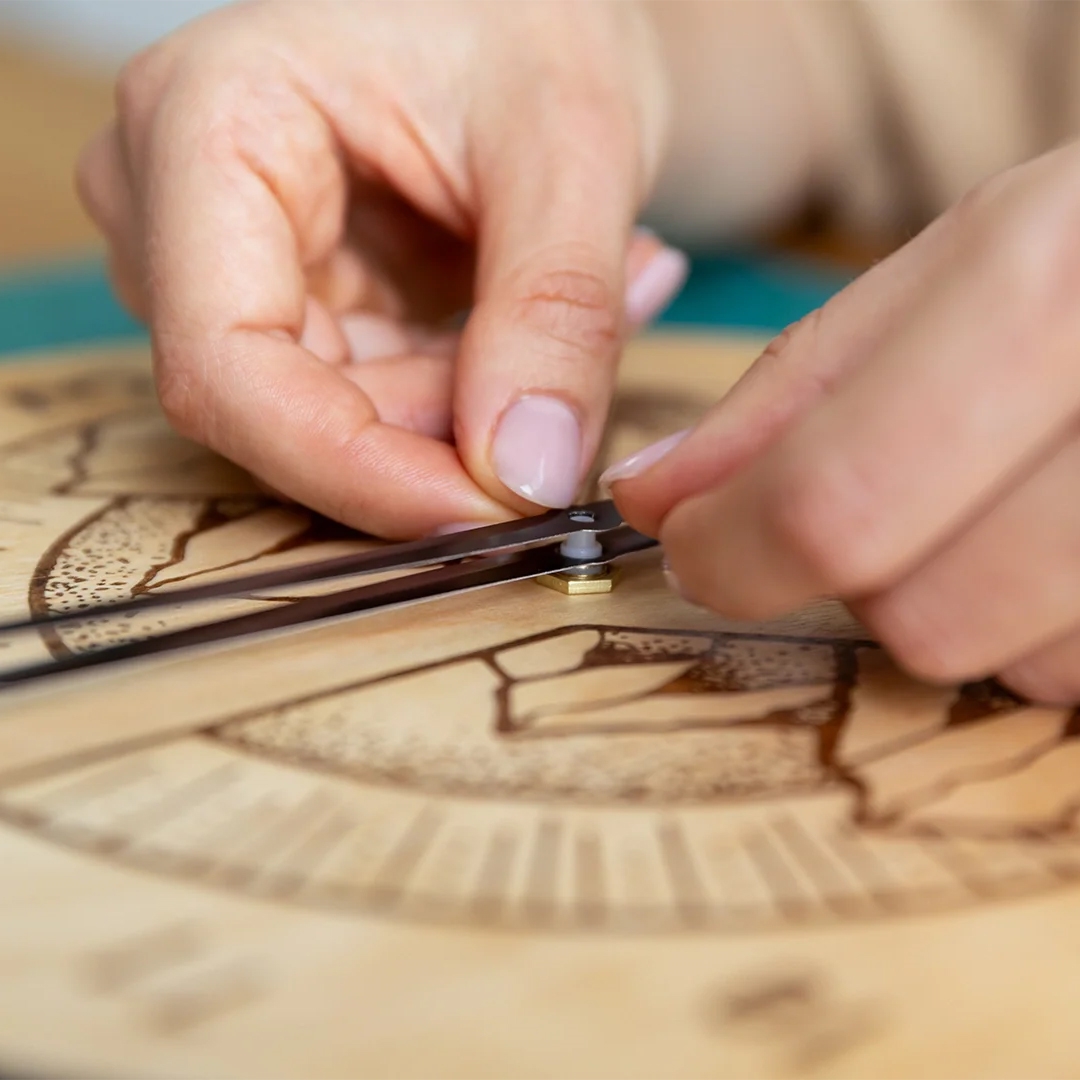 Selve urværket består af en træskive med 28 cm i diameter og 8 mm tykkelse. Der medfølger også en øveplade, så du kan teste temperatur og strøg, inden du går i gang med dit endelige design.
