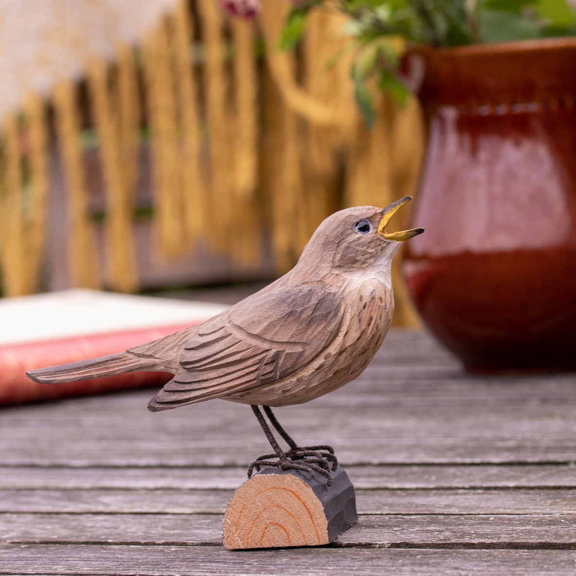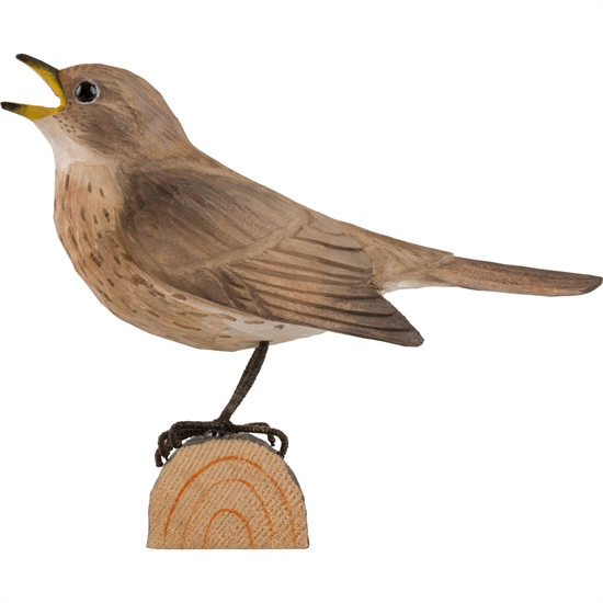 Nattergalen er håndskåret i lindetræ og håndmalet med vandbaseret maling. Den er afbildet i en syngende positur i naturlig størrelse. Fuglen vil være et smukt indslag i din boligindretning og en tidløs og unik gave til alle, der holder af natur og dyr.