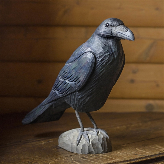 Indhyllet i myter har ravnen længe været forbundet med ondskab, død og okkultisme. Dens ry strækker sig over næsten alle verdens kulturer gennem århundreder. Denne dygtigt håndskårne træfugl indfanger ravnens gådefulde udtryk.