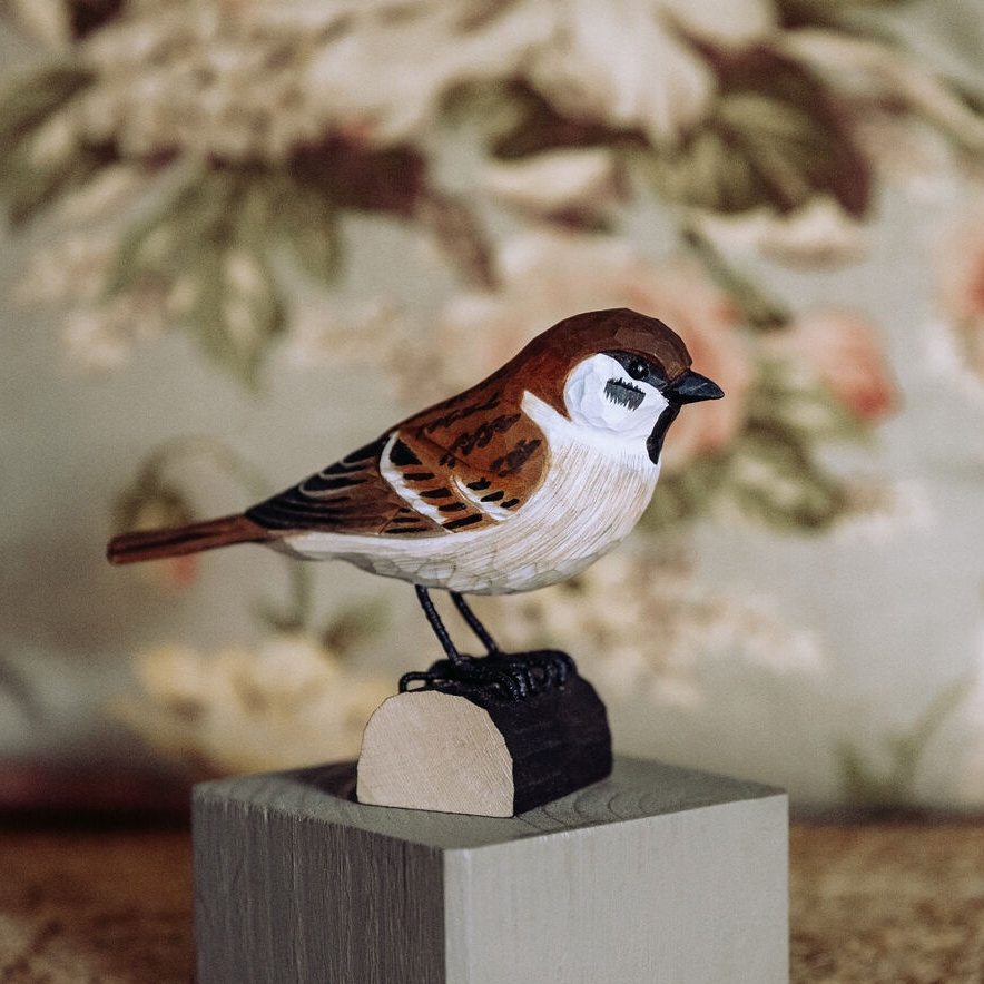 DecoBird Skovspurv er en naturtro træfugl, håndskåret og håndmalet. Denne fugl forveksles ofte med sin nabo, husspurven. Et sikkert kendetegn ved skovspurven er dog den mørkebrune plet på kinden.