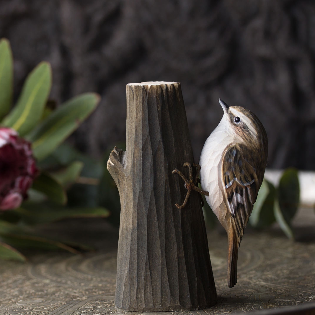 DecoBird Træløber indfanger på fin vis denne energiske fugl, netop som den smutter op ad en træstamme. Det slanke, let nedadbøjede næb og den plettede fjerdragt giver et legende, men samtidig klassisk udtryk, som passer smukt i en reol eller på en kommode.