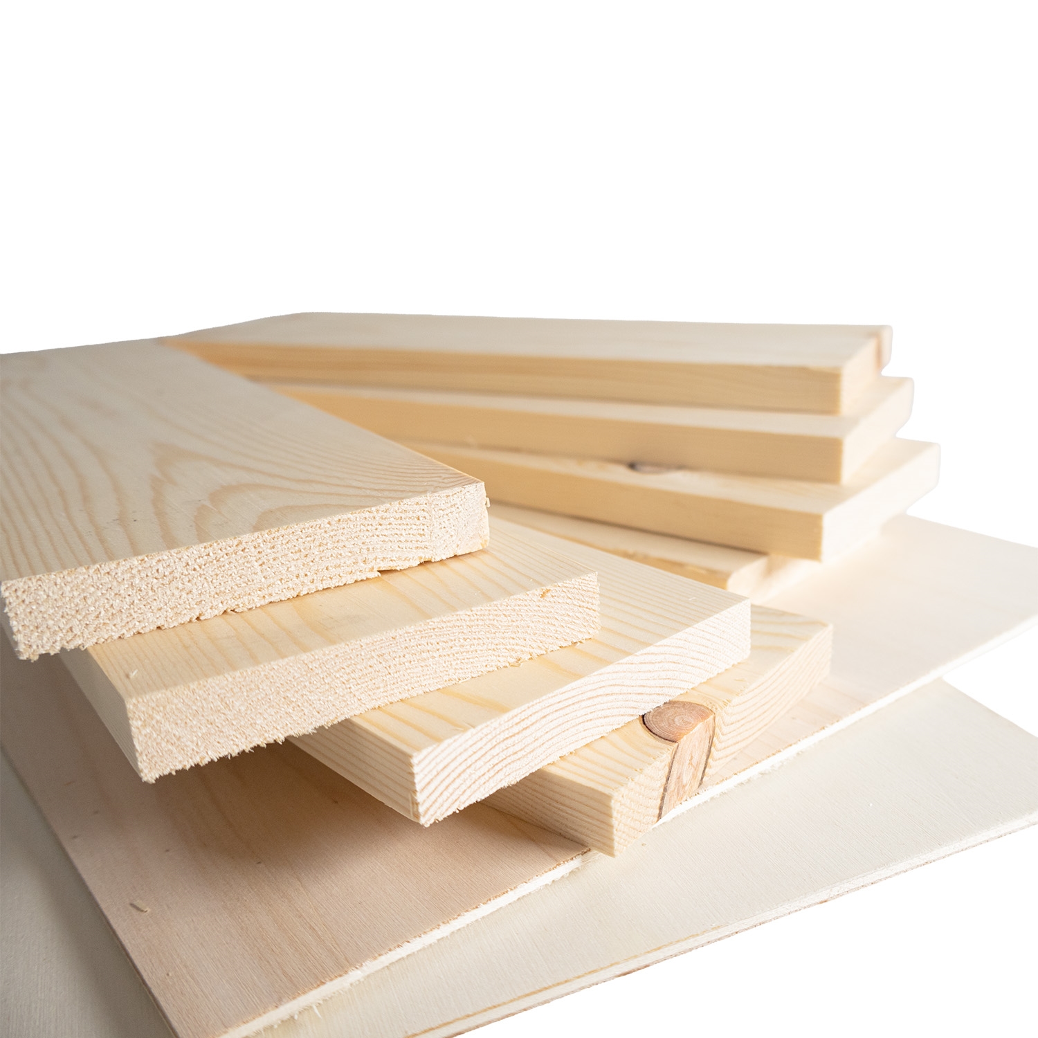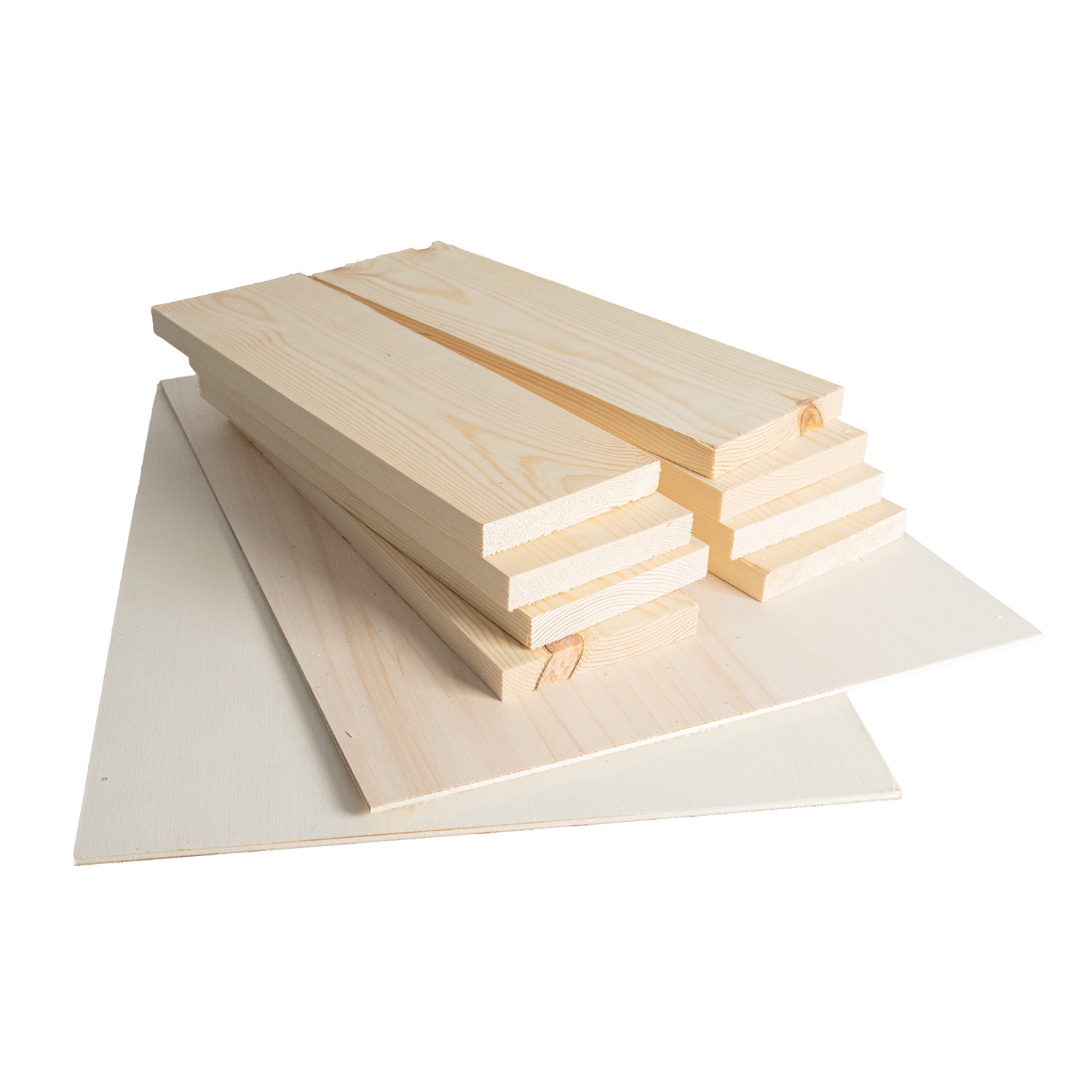 En lille træpakke til børn gør det nemt at komme i gang med at bygge og lege med træ. Træet er allerede høvlet og skåret i håndterbare stykker, så barnet kan begynde straks – uden at en voksen først skal save eller forberede materialet.