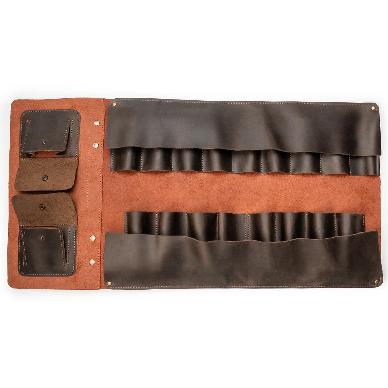 Fremstillet af eksklusivt crazy horse-læder, kombinerer denne værktøjsrulle styrke og elegance. Det mørkebrune ydre signalerer praktisk funktionalitet, mens det lysere brune indre udstråler sofistikering. Den behagelige læderfølelse tilfører en luksuriøs dimension til din daglige rutine, samtidig med at materialets holdbarhed beskytter dine værktøjer effektivt.